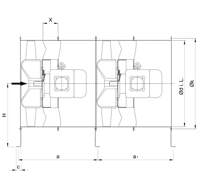 2 in Reihe geschalteten Ventilatoren. Schachtgehäuse in geschweißter Stahlblechausführung mit gebohrten Flanschen nach DIN